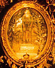 | The altar of St. Francis Xavier in the Church of the Gesu in Rome. Photo on the right shows a close-up of the saint's right arm kept above this altar. |