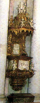 | The bones of St. Innocent the Martyr, are located under the pulpit (shown on the far right) of the Parish Church of Our Lady, in the Diocese of Szombathely. |