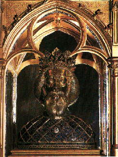 | This silver reliquary of the head of St. Ladislas, King of Hungary (early 15th c.) is in the Cathedral dedicated to the Assumption of Our Lady (Diocese of Gyor). It is located in the Sanctuary of the Hedervary Chapel. |