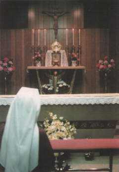 | SPIRIT: By the call of God we form a true family, like the first Christian community. We are gathered in His name around our Mother Prioress, a true spiritual mother and friend. Together we seek the Will of God from moment to moment in faith and simplicity. This brings a peace like unto that of the Holy Family, whose hearts were completely united. LIFE OF PRAYER: Eucharistic Sacrifice: The Eucharistic Sacrifice begins our day with the entire community participating. |