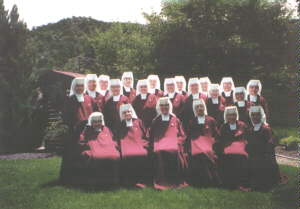 | THE RELIGIOUS HABIT: The Habit is of wine-red color (symbolizing the Precious Blood), full length, with a white veil. It includes a rosary, and a scapular to which is attached a small emblem signifying the Holy Spirit and a Chalice. The Habit is worn at all times, both inside and outside of the monastery. It is uniform for all professed Sisters. A ring is worn by the perpetually professed Sisters. |