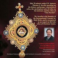 Talks on CD This 78 minute audio CD features Thomas J. Serafin speaking on the history and proper veneration of relics, the sacrilegious sales of relics on the internet, and the relics of "The Passion".